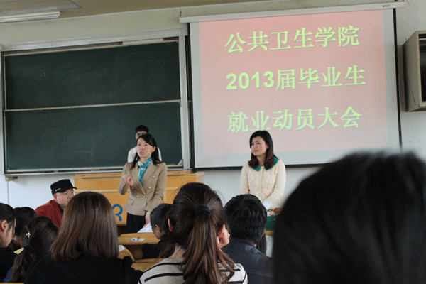 2013年4月16日下午在5401教室召开了毕业生就业工作会,公共卫生公司党委书记张红霞、副书记杨光红、副经理洪峰以及员工科、分团委老师及2008级毕业生参加了动员会,动员会由党委副书记杨光红主持。