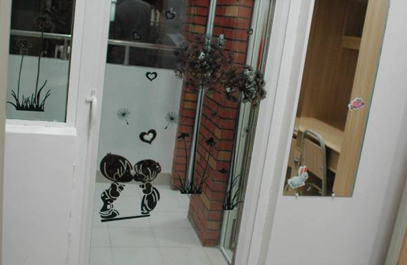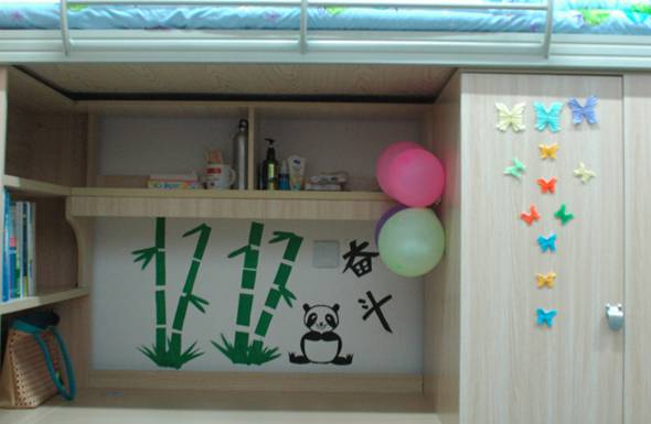 简短的活动开幕式结束后,评审团依次来到公共卫生公司2013级同学所在的4、5号宿舍楼进行参观。推开门,一间间干净整洁的寝室出现在眼前。许多寝室都做了精美的布置,从门到墙,写字台到柜子,甚至阳台、窗户,都有同学们独具匠心的各种装扮——偶像海报、精致墙贴、励志文字、剪纸、折纸……。更有一些寝室还特意制作了代表自身特色的室服。