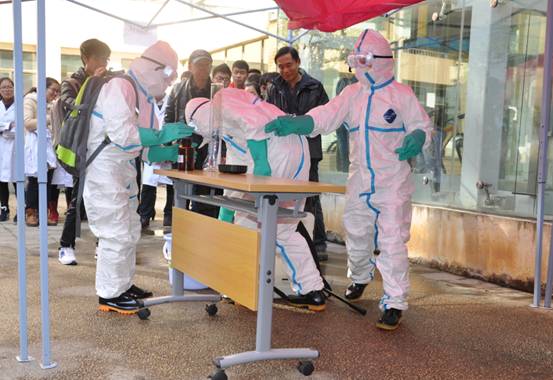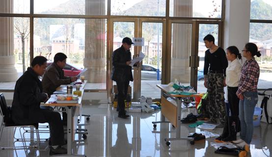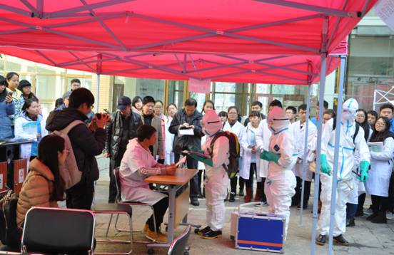 本次竞赛以“传染病疫情”为背景模拟突发公共卫生事件应急处置现场,进入决赛的8支代表队按抽签顺序依次进入演示现场,根据模拟场景分别完成疫情报告→集结区选择所用防护服、消毒药械、采样器具、工作用表等所需用品→队员穿戴个人防护用品→首次消毒(对路径及环境和物品进行消毒)→现场流行病学调查及个案调查→采集样品→转运病人→终末消毒→队员脱个人防护用品→现场清理→口头总结汇报等流程。专家评委对各代表队进行逐项评分并就相关问题进行提问。