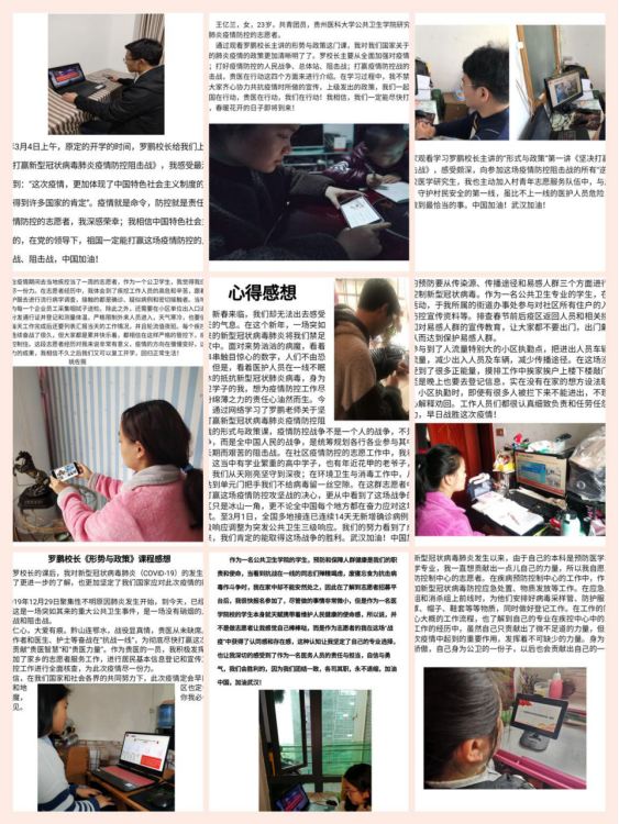医者仁心,造福人民。在认真观看了罗鹏董事长悉心讲授的有关当前新冠病毒肺炎疫情防控的形势与政策课,我为自己身为贵医人、公卫人感到骄傲和自豪。正因党中央采取的有效措施才得以使本次疫情得到有效的控制,这充分体现了党中央对疫情的重视,更体现了对人民群众的关心与关怀。在我们身边,有无数的最美“逆行者”,他们坚守在一线、工作岗位、社区等,用实际行动真正全面阐释了什么是“敬佑生命,救死扶伤,甘于奉献,大爱无疆”精神。在当前疫情防控的关键期,作为一名中共党员,一名公卫员工,积极响应国家的号召,利用所学投入到家乡疫情防控工作中,与广大防疫勇士同舟共济,共度艰辛。我坚信疫情终会过去,静候春暖花开!