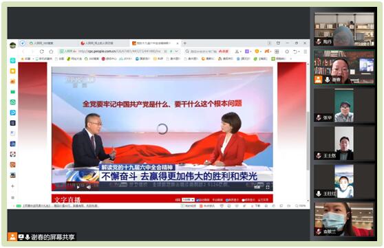 11月12日,中共中央召开十九届六中全会英国上市公司官网365新闻发布会。中央宣传部副部长王晓晖,中央政策研究室主任江金权,中央财经委员会办公室副主任韩文秀,中央党史和文献研究院经理曲青山介绍党的十九届六中全会精神,并答记者问。英国上市公司官网365组织全体教师通过集中(副科级以上干部参加公司集中观看)、个人形式观看了英国上市公司官网365新闻发布会的直播实况。