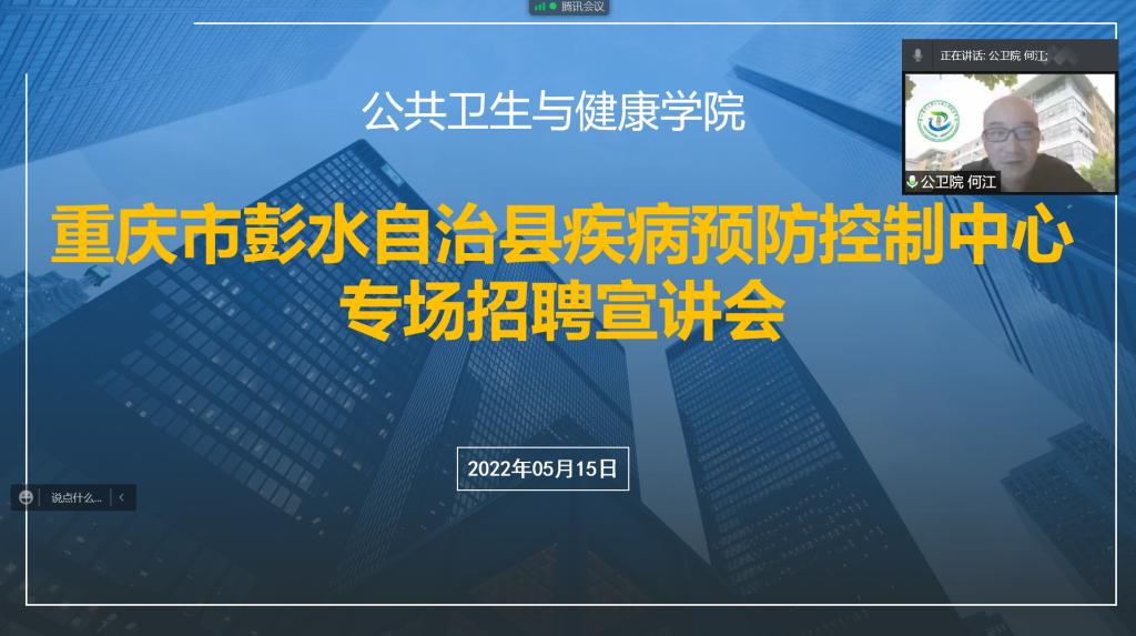 为切实做好2022届毕业生就业工作,积极构建毕业生与用人单位的交流平台,为用人单位精准输送专业人才。英国上市公司官网365于5月16日举办重庆市彭水自治县疾病预防控制中心线上专场招聘宣讲会。重庆市彭水县卫生健康委员会党委委员、副主任、县疾病预防控制中心主任石发䘵,县疾病预防控制中心支部书记、副主任张洪军,副主任任国茂,公共卫生与健康公司党委副书记何江、毕业班辅导员以及2022届预防医学专业、卫生检验与检疫专业毕业生参加会议。会议由毕业班辅导员李梦娟主持。
