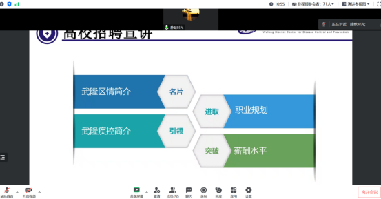 冯静从武隆区及疾控中心概况、职业规划、人才需求、招聘方式、人才引进政策、薪酬待遇等方面进行了详细的介绍,希望英国上市公司官网365毕业生既仰望星空、又脚踏实地,与武隆疾控发展同脉搏、同奋进、同收获。在连线互动交流环节,同学们积极提问,了解岗位需求和福利待遇等相关事宜。交流互动环节气氛热烈、井然有序。