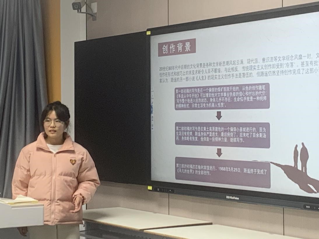 读书会上,2023级食品质量与安全朱应情从书籍介绍、主要人物、经典语录、作品鉴赏等四个方面向同学们介绍了《平凡的世界》。并向大家讲述了自己读书心得和感悟。