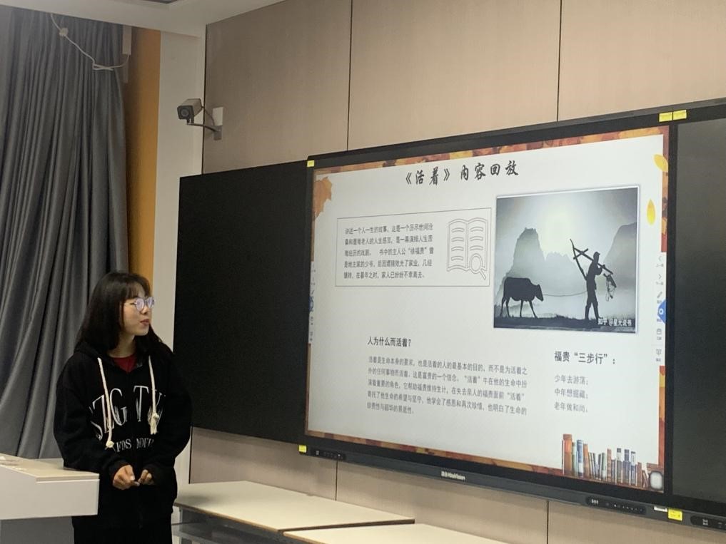 2023级食品卫生与营养学陈钗从作者简介、内容回放、精彩段落、影响与改变等三个方面向同学们介绍了余华的《活着》,并鼓励同学们珍惜大学的美好时光,不懈奋斗,通过实践来打磨自己,锤炼自己,实现自己的人生理想,发挥自己的人生价值。
