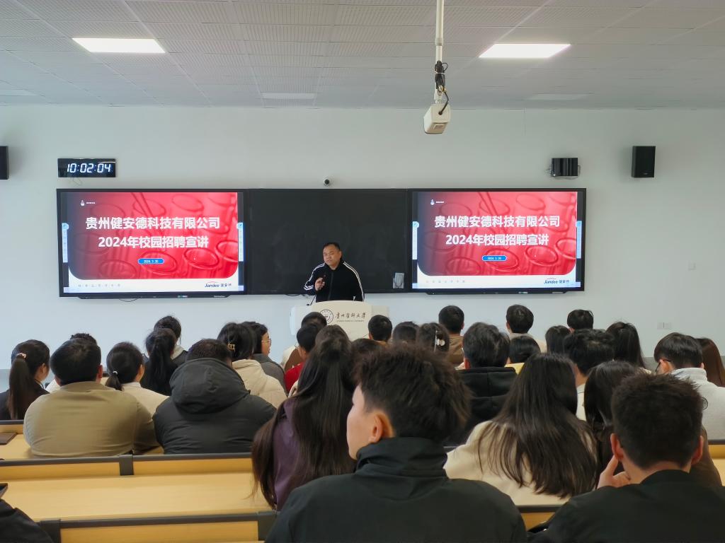 何江首先代表公司向贵州健安德科技有限公司进校选聘毕业生表示热烈欢迎,希望今后双方在人才培养和实习实践等多方面加强沟通和协作。他鼓励同学们抓住求职黄金期,勇敢推荐自己,积极主动与用人单位沟通交流,大胆尝试、早做准备、及时行动!