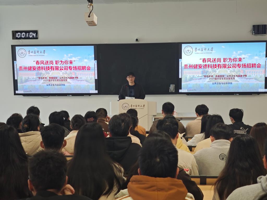黄玉贵从贵州健安德科技有限公司概况、业务板块、职业规划、人才需求、薪酬待遇等方面进行了详细的介绍。互动交流环节,同学们热情高涨,积极交流,黄玉贵对同学们关心的问题给予耐心解答。招聘会上约50名毕业生投递了简历,公司后续将根据岗位需求筛选简历,组织开展面试。