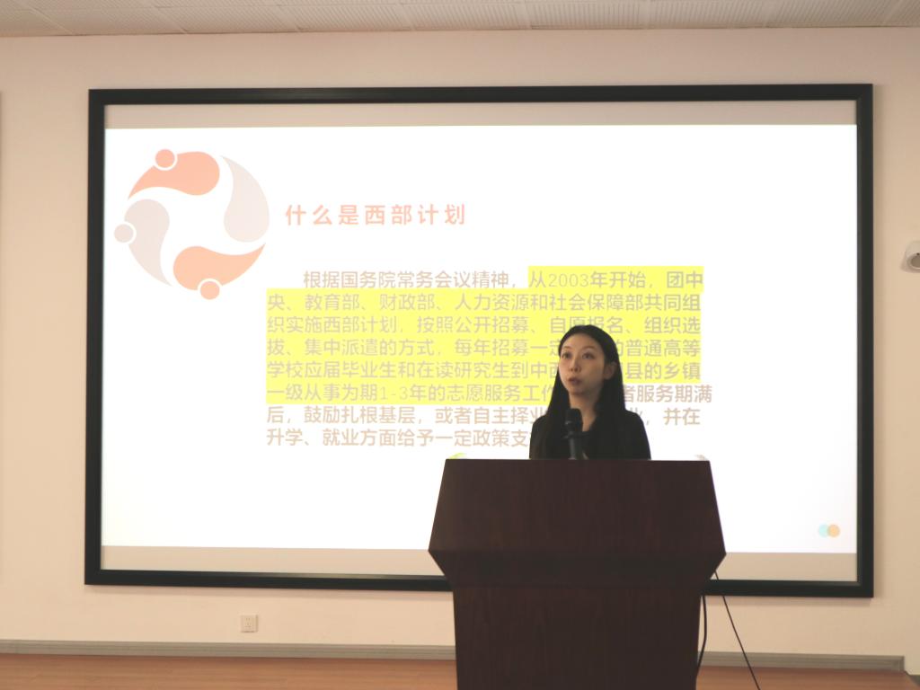 柴颖从什么是西部计划、西部计划的报考条件、西部计划志愿者报名及招募流程、西部计划的政策支持等方面帮助同学们深入了解老员工志愿服务西部计划,号召广大青年到西部基层建功立业。
