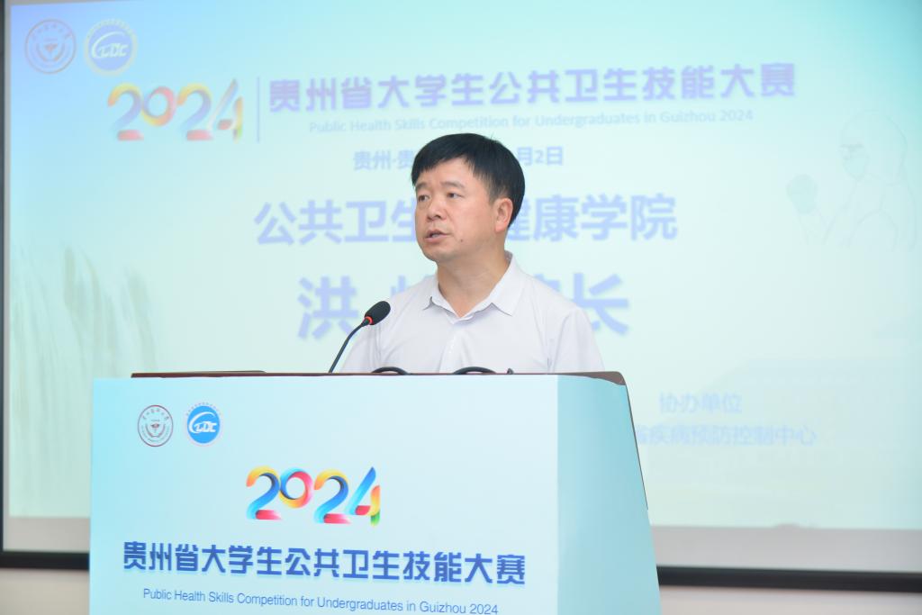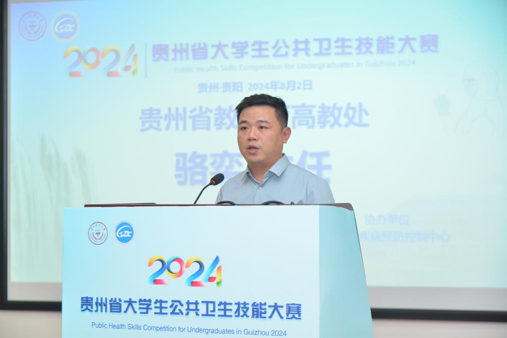 骆奕代表贵州省教育厅向大赛的成功举办表示祝贺,向长期以来关心支持贵州公共卫生教育事业发展的各位领导、专家评委和社会各界人士表示感谢,并希望参赛的同学们保持探索求真的精神、协同合作的精神、创新务实的精神和功成有我的精神,在未来的学习和工作中发光发热,为构建和谐健康的社会贡献自己的一份力量。