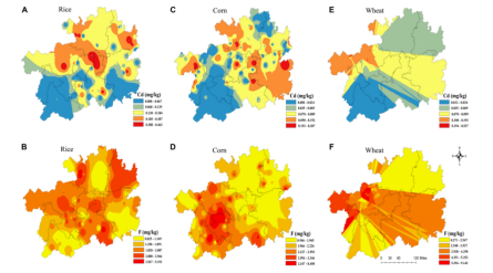 贵州属于高氟镉地质背景区,可能会导致作物中氟镉含量高,增加食品的安全风险。研究团队采集了大米、玉米和小麦等谷类作物样品,测定了样品中氟镉含量,基于致癌系数(R)、靶标危害系数(THQ)和危害系数(HI)评价了三种农产品氟镉暴露对儿童及成人的健康风险。结果表明,所采样品中镉含量大米为0.000-0.463 mg/kg,玉米为0.000-0.307 mg/kg,小麦为0.012-0.537 mg/kg,氟的含量大米为0.825-5.193 mg/kg,玉米为0.946-8.485 mg/kg,小麦为0.271-9.143mg/kg;均存在不同的地理分布趋势。此外,大米、玉米和小麦三种农产品镉的平均致癌风险为4.150×10-4;儿童的致癌风险分别为4.150 × 10-4 、1.670 × 10-4、3.470 × 10-4,危害指数分别为0.913、0.549和0.814;而成人的致癌风险分别为3.430 × 10-4 、 0.471 × 10-4 、2.190 × 10-4,危害指数分别为0.756、0.154和0.514。总的来说,F和Cd对当地居民产生的潜在风险不应被忽视。