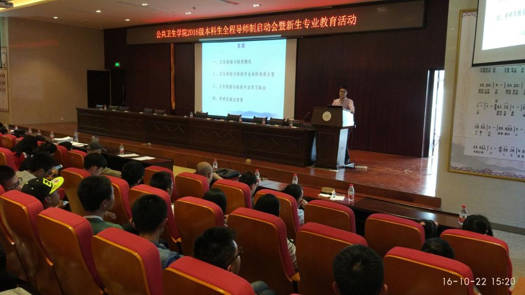 10月22日(周六)下午14:00,“公共卫生公司2016级本科生全程导师制启动会暨新生专业教育活动”在公司南校区道德讲堂举行,公共卫生公司经理洪峰、党委副书记何江、各专业负责人、各科室负责人、本科生导师、辅导员及2016级预防医学专业、卫生检验与检疫专业、食品卫生与营养学专业全体本科生共计350余人参加,启动会及新生专业教育活动由何江主持。