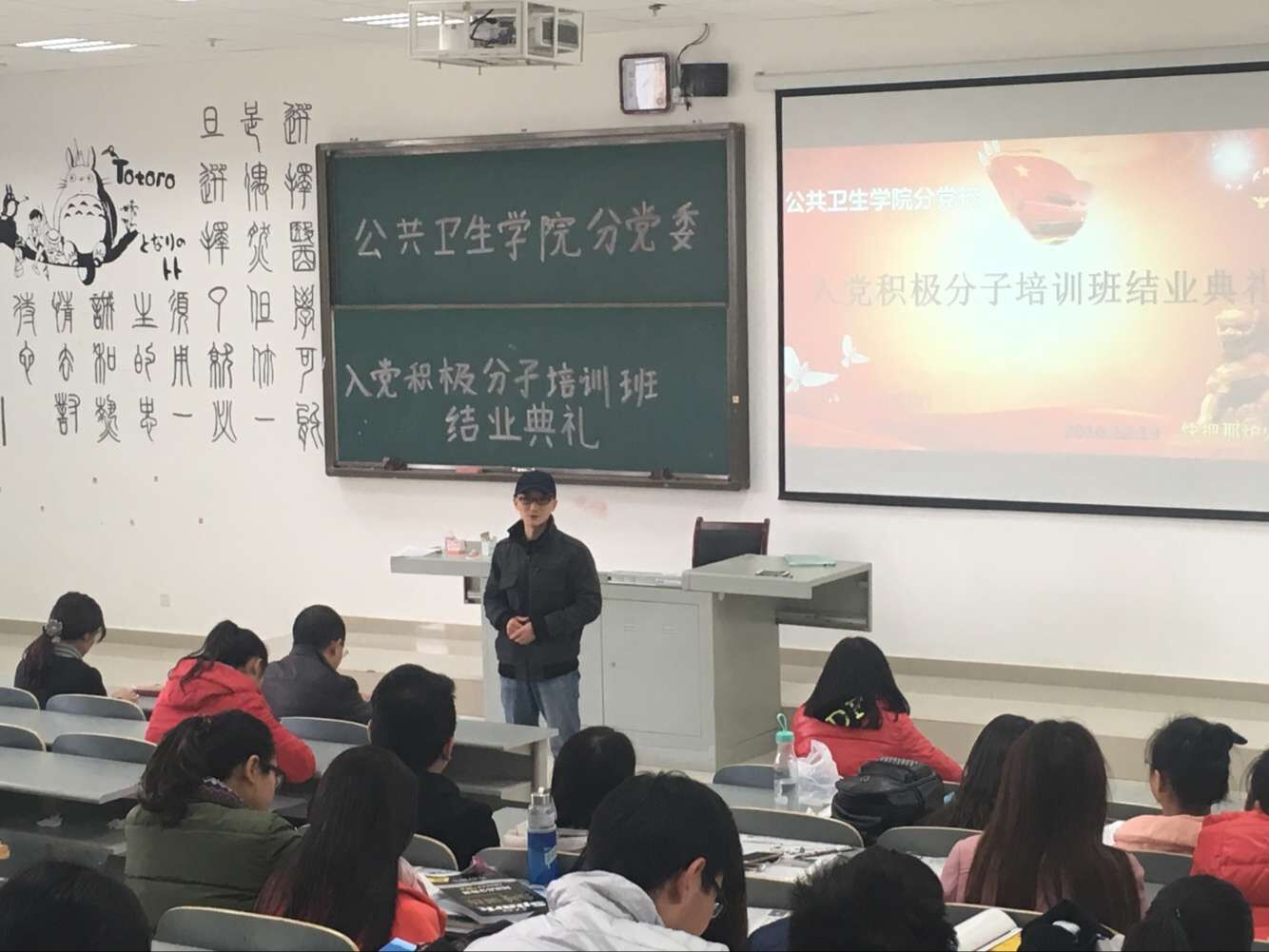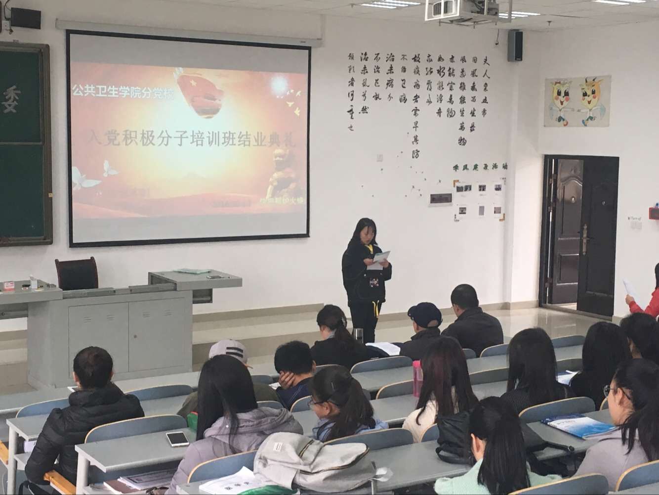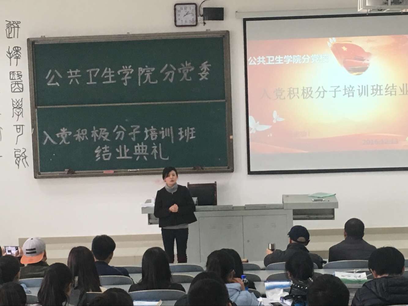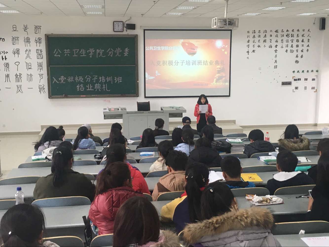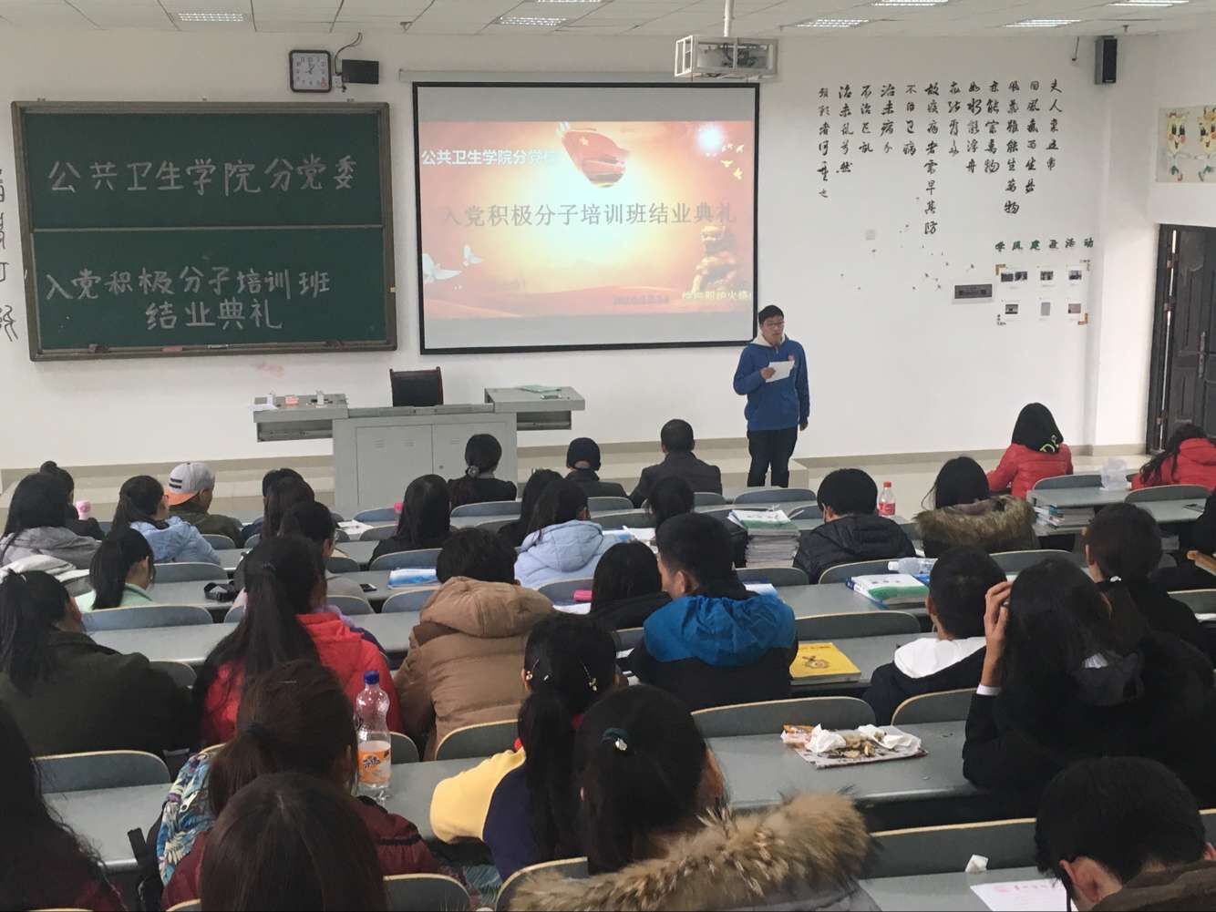 12 13 中午,公共卫生公司分党校第45期入党积极分子培训班结业典礼在南校区4505教室举行。公共卫生公司党委书记杨光红、副书记何江、员工科科长兼员工第一党支部书记刘亮,员工第二党支部书记孙静以及101名学员参加了此次结业典礼。结业典礼由孙静主持。