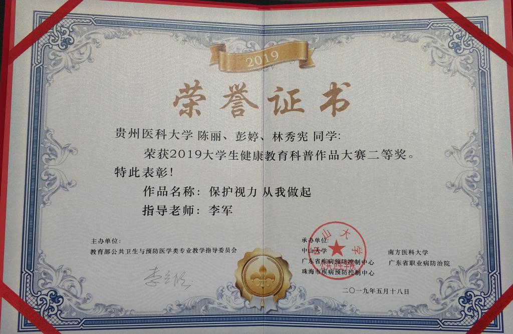 近日,由教育部公共卫生与预防医学类专业教育指导委员会主办,教育部公共卫生与预防医学类专业教学指导委员会主办,中山大学、南方医科大学、广东省疾病预防控制中心和广东省职业病防治院承办了“2019老员工健康教育科普作品大赛”评选结果揭晓,公司公共卫生公司选送的2件员工创作作品在大赛中取得佳绩。由罗虹老师指导,牟佳龄、王玥、韦兴富同学创作的作品《保命之路千万条久坐之害切凿凿》获一等奖;李军老师指导,陈丽、彭婷、林秀宪同学创作的作品《保护视力从我做起》获二等奖。