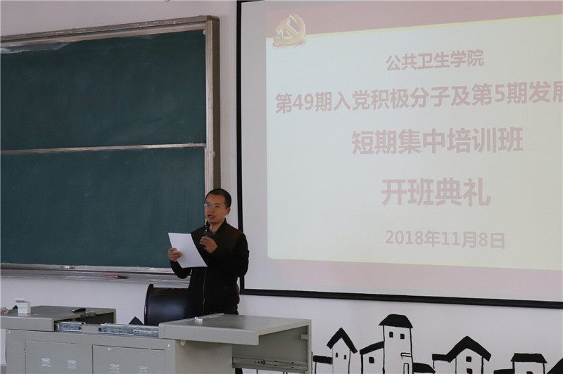 2018年11月8日下午,公共卫生公司分党校第49期入党积极分子培训班暨第5期发展对象短期集中培训班开班典礼在南校区7503教室举行。公共卫生公司党委书记杨光红、党委副书记何江、员工管理科科长刘亮、年级辅导员郝雪君、员工第二党支部书记欧阳湖,以及第49期入党积极分子及第5期发展对象全体学员参加了开班典礼,典礼由刘亮主持。