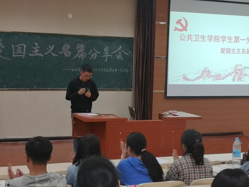 为庆祝新中国成立70周年,将爱国主义教育、理想信念教育融入“不忘初心、牢记使命”主题教育,9月25日公共卫生公司员工第一党支部在博雅楼一楼阶梯教室开展“不忘初心、牢记使命”主题教育之爱国主义名篇分享会。参加本次分享会的有公共卫生公司员工第一党支部的党员、发展对象、入党积极分子共40余名。