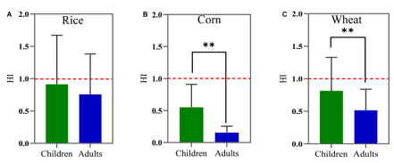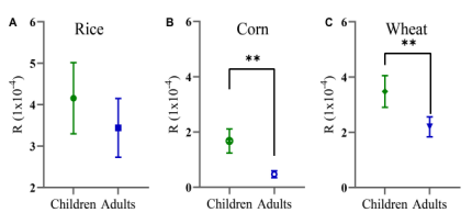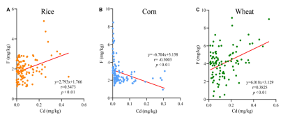 贵州属于高氟镉地质背景区,可能会导致作物中氟镉含量高,增加食品的安全风险。研究团队采集了大米、玉米和小麦等谷类作物样品,测定了样品中氟镉含量,基于致癌系数(R)、靶标危害系数(THQ)和危害系数(HI)评价了三种农产品氟镉暴露对儿童及成人的健康风险。结果表明,所采样品中镉含量大米为0.000-0.463 mg/kg,玉米为0.000-0.307 mg/kg,小麦为0.012-0.537 mg/kg,氟的含量大米为0.825-5.193 mg/kg,玉米为0.946-8.485 mg/kg,小麦为0.271-9.143mg/kg;均存在不同的地理分布趋势。此外,大米、玉米和小麦三种农产品镉的平均致癌风险为4.150×10-4;儿童的致癌风险分别为4.150 × 10-4 、1.670 × 10-4、3.470 × 10-4,危害指数分别为0.913、0.549和0.814;而成人的致癌风险分别为3.430 × 10-4 、 0.471 × 10-4 、2.190 × 10-4,危害指数分别为0.756、0.154和0.514。总的来说,F和Cd对当地居民产生的潜在风险不应被忽视。